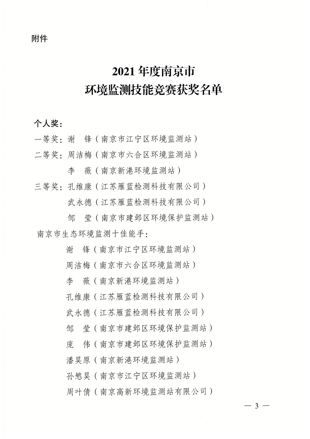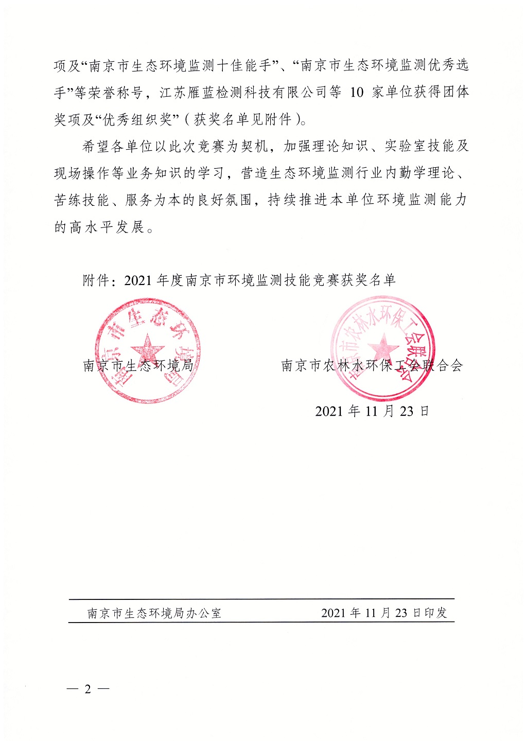 10月16日-27日,由南京市總工會(huì)、市人力資源和社會(huì)保障局、共青團(tuán)南京市委主辦,南京市生態(tài)環(huán)境局和南京市農(nóng)林水環(huán)保工會(huì)聯(lián)合會(huì)承辦,江蘇省南京環(huán)境監(jiān)測中心協(xié)辦,南京環(huán)境保護(hù)產(chǎn)業(yè)協(xié)會(huì)支持的2021年南京市環(huán)境監(jiān)測技能競賽決賽在江寧橫溪街道正式開賽,來自市生態(tài)環(huán)境系統(tǒng)和社會(huì)化環(huán)境監(jiān)測機(jī)構(gòu)的16支環(huán)境監(jiān)測隊(duì)伍在此聚集進(jìn)行環(huán)境監(jiān)測大比武。本次競賽由南京市生態(tài)環(huán)境局局長錢鋒擔(dān)任競賽組委會(huì)主任,同時(shí)專設(shè)專家及監(jiān)督委員會(huì),確保競賽結(jié)果公正公允。我司也派出選手參賽,取得團(tuán)體一等獎(jiǎng)和多個(gè)個(gè)人獎(jiǎng)項(xiàng)的佳績!