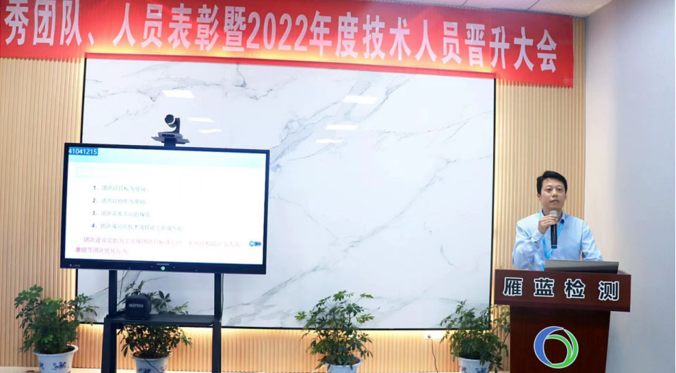 2022年5月13日,雁藍檢測在江寧本部召開2021年度表彰暨2022年度職務晉升大會。公司總經(jīng)理張布偉、副總經(jīng)理蔡同鋒,江寧本部和江北分場所相關(guān)人員參加會議,會議由副總經(jīng)理周君主持。