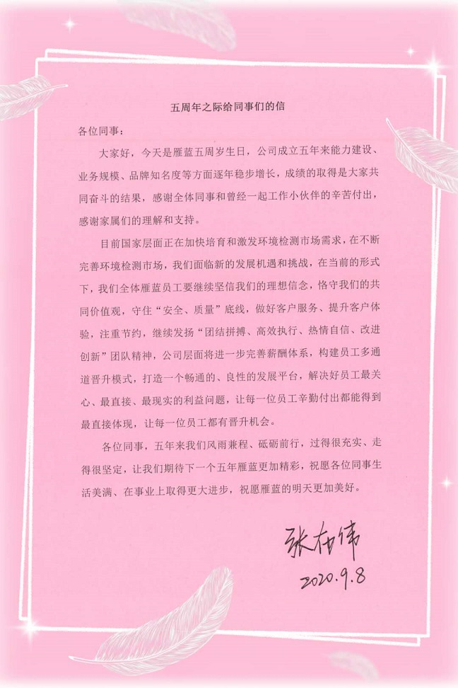 在江蘇雁藍檢測科技有限公司成立五周年之際,總經(jīng)理張布偉發(fā)出給同事們的信,信中肯定雁藍檢測這五年來奮斗的成績,感謝全體同事和曾經(jīng)一起工作過的小伙伴的辛苦付出,展望下一個五年,希望雁藍人既能守住雁藍檢測的“安全、質(zhì)量”底線,做好客戶服務(wù),提升客戶體驗,又能不斷進步打造一個暢通、良性發(fā)展平臺,為員工謀福利,讓我們期待下一個五年雁藍更精彩。